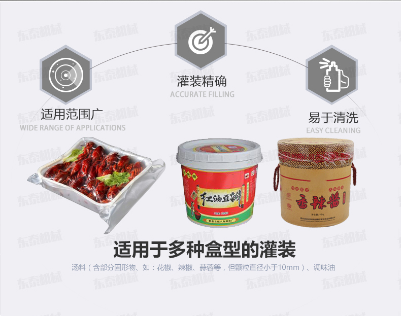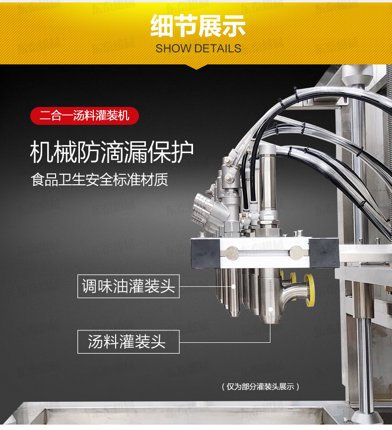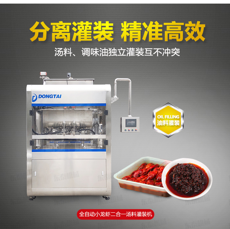 1.灌裝機在參考國外同類產(chǎn)品的基礎(chǔ)上進行改良設(shè)計,特制湯料、調(diào)味油灌裝頭,機械防滴漏保護,在灌裝過程中不會污染包裝容器。