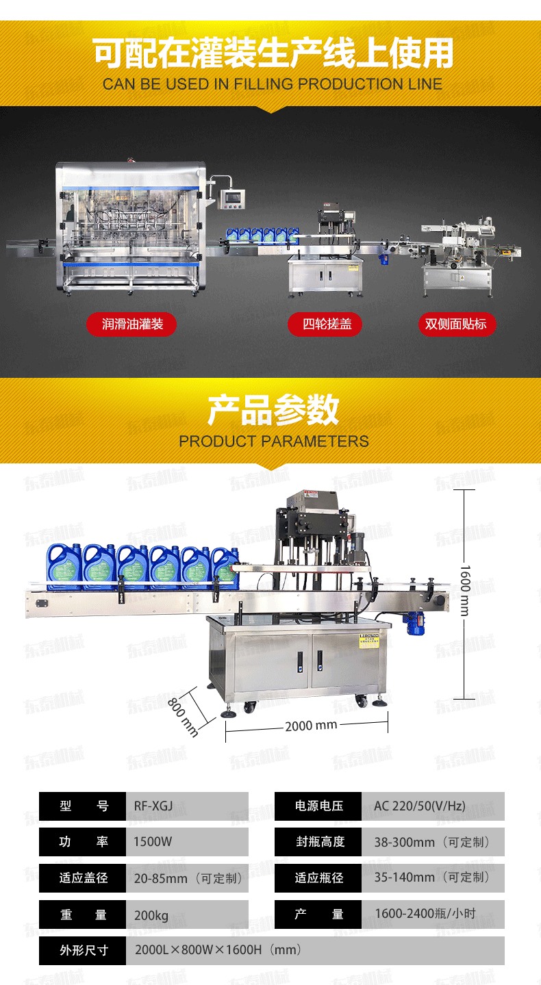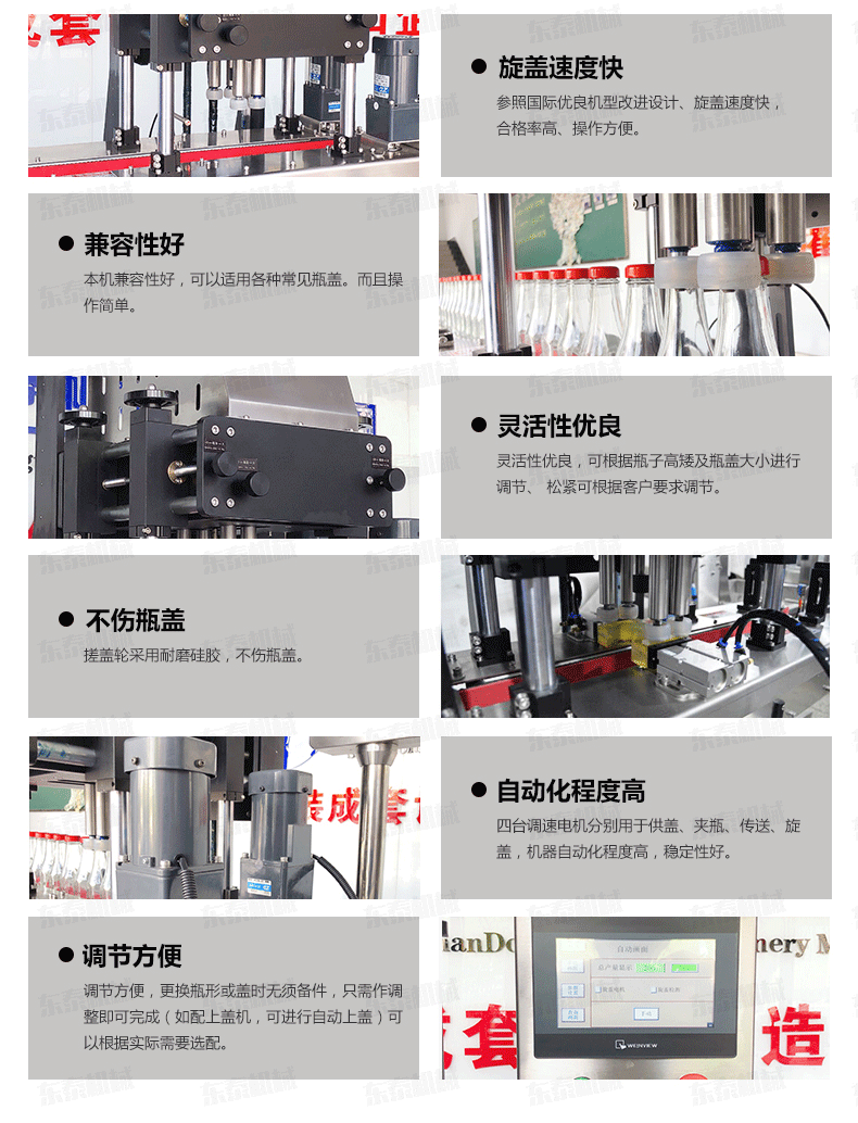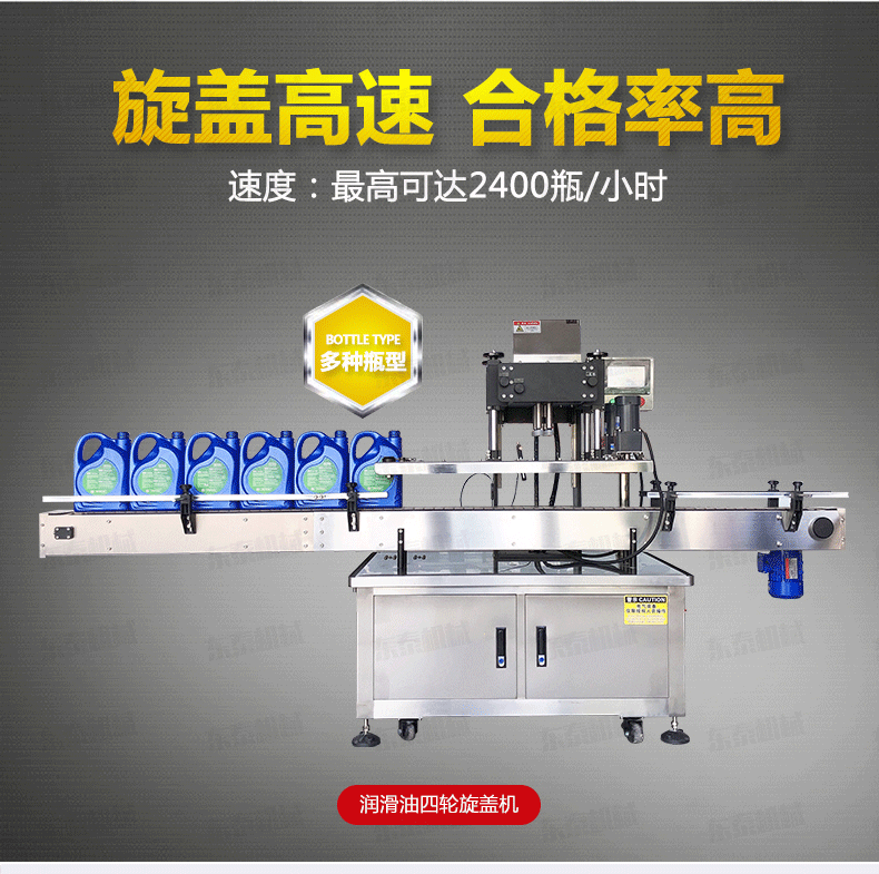 全自動旋蓋機是參照國機型改進設計、旋蓋速度快,合格率高、操作方便。可適用于食品、制藥、日化、農(nóng)藥、化妝品等行業(yè)的不同瓶形的旋蓋。四臺調(diào)速電機分別用于供蓋、夾瓶、傳送、旋蓋,機器自動化程度高,穩(wěn)定性好,調(diào)節(jié)方便,更換瓶形或蓋時無須備件,只需作調(diào)整即可完成(如配上蓋機,可進行自動上蓋)可以根據(jù)實際需要選配。