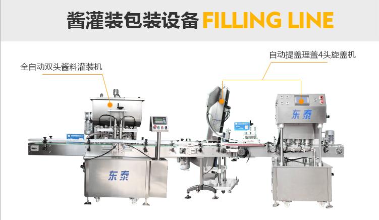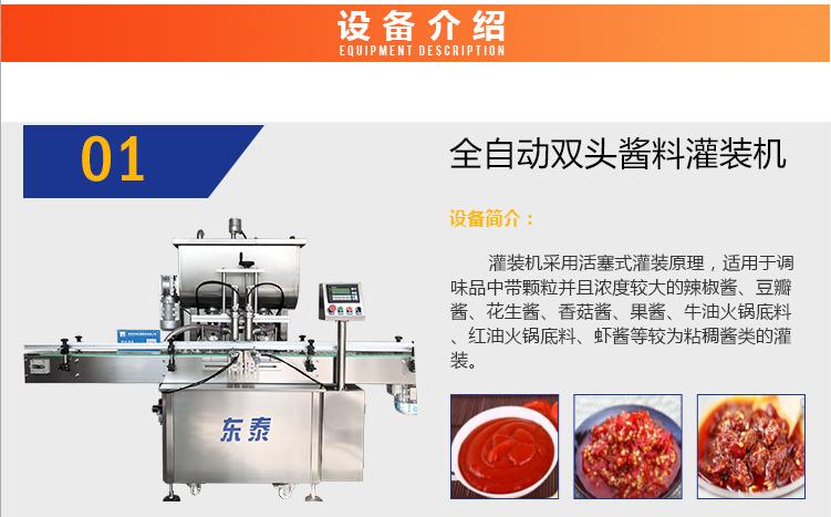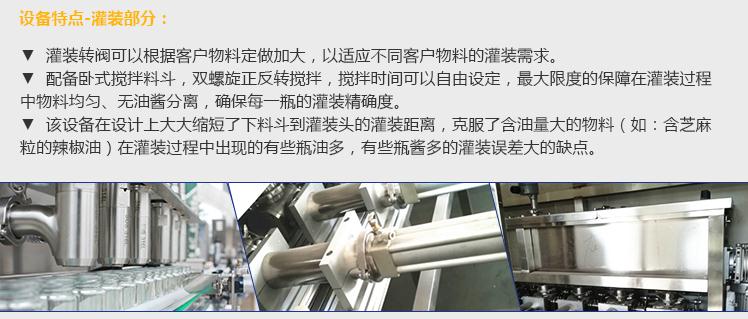 灌裝機(jī)采用活塞式灌裝原理,適用于調(diào)味品中帶顆粒并且濃度較大的辣椒醬、豆瓣醬、花生醬、香菇醬、果醬、牛油火鍋底料、紅油火鍋底料、蝦醬等較為粘稠醬類的灌裝。