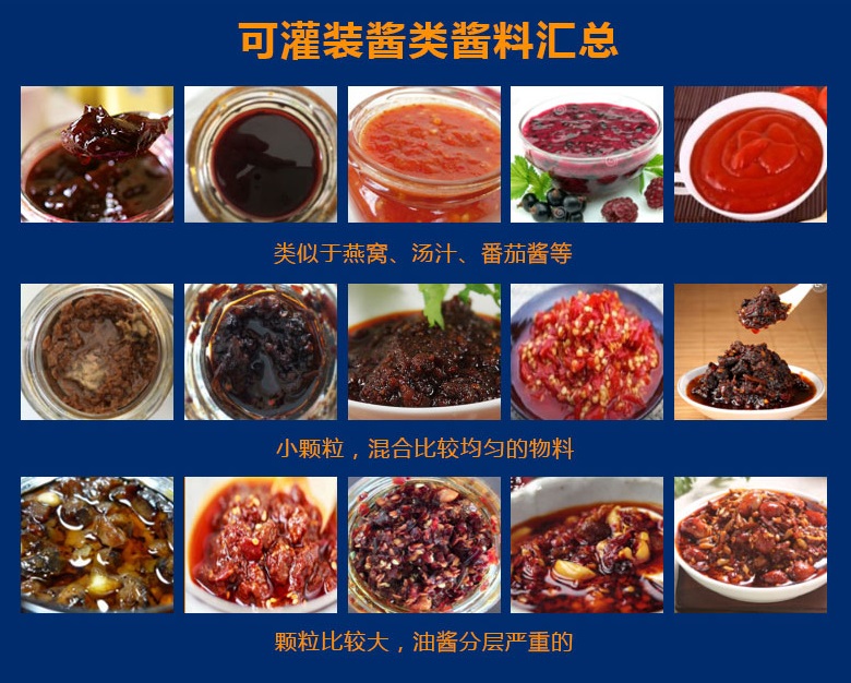 醬料灌裝生產(chǎn)線采用活塞式灌裝原理,適用于調(diào)味品中帶顆粒并且濃度較大的辣椒醬、豆瓣醬、花生醬、香菇醬、果醬、牛油火鍋底料、紅油火鍋底料、蝦醬等較為粘稠醬類的灌裝。
