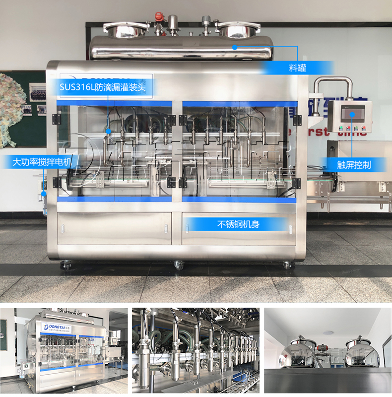 東泰生產(chǎn)的這款醬料灌裝機采用高新灌裝機技術(shù)的基礎(chǔ)上,進行改造和創(chuàng)新設(shè)計的產(chǎn)品,配有自動攪拌功能,結(jié)構(gòu)簡單、精確度高、操作更加簡便。它操作方便,氣動部分均采用德國FESTO和臺灣AirTac的氣動元件。灌裝閥由氣動閥控制,灌裝精度更高,灌裝量和灌裝速度均可任意調(diào)節(jié),灌裝悶頭采用防拉絲及升降灌裝裝置,物料接觸部分均采用316L不銹鋼材料制成,符合GMP要求。